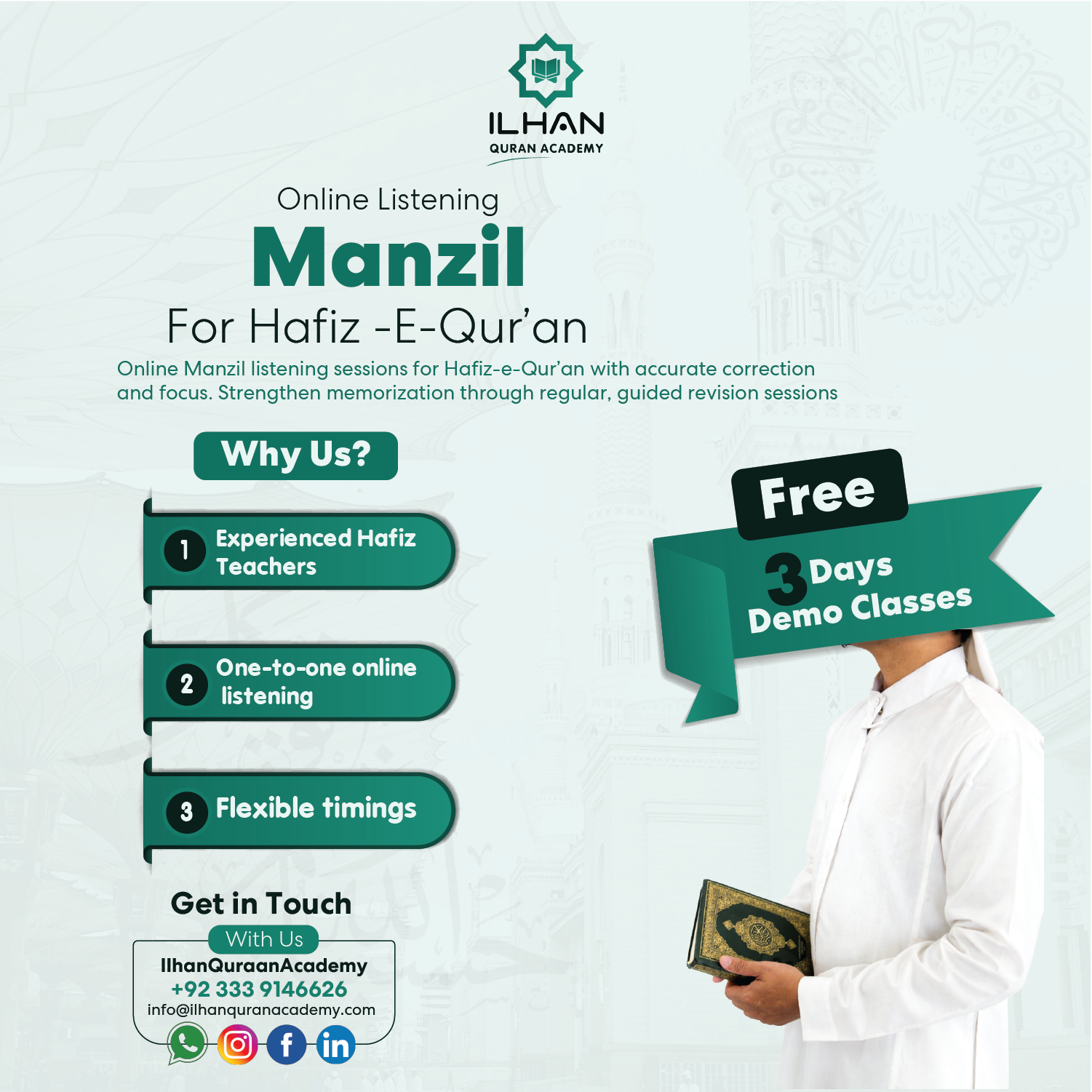 Choose from our wide range of Quran courses, including Qaida, Nazrah, Hifz, Tajweed, and Arabic accent training. Ilhan Quran Academy offers structured lessons to help you read, recite, and memorize the Quran with confidence, suitable for all levels.